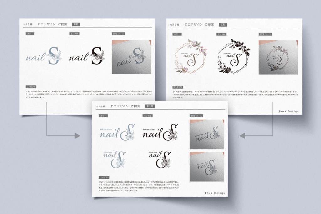 そこでまずサロンの目指す方向性や顧客ターゲット層を設定し、nail Sの提供するサービスの「独自性」や「らしさ」に加え、幸さんの雰囲気やキャラクターを的確に表現し、末長く使っていただけるようなロゴデザイン制作を目指しました。施術の際には、肌に優しいキャリアオイル(植物から抽出されたオイル)を使用されていましたので、原料となるホホバ・米ぬか・カレンデュラなどのモチーフを取り入れ、オーガニックやボタニカルといったキーワードを思い浮かべながら制作し、3案提案させていただきました。どの案も「イメージ通りでかなり感動の域です!」と大変気に入って頂き、最終的にはコンセプトを忠実に現すB案と、アンティークな柔らかな雰囲気が目指す世界観に近いC案、どちらも捨てがたいと大変悩まれている様子でした。
