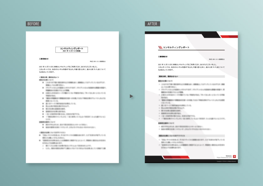 確かにいくら内容が良くても、書体や行間・文字サイズ・余白等が整っていなければ非常に読みづらい上、ぱっと見「なんだか大したことのない普通の資料だな」という印象を持たれてしまって勿体ないですからね!形のないサービスだからこそ、見た目の付加価値は重要です。